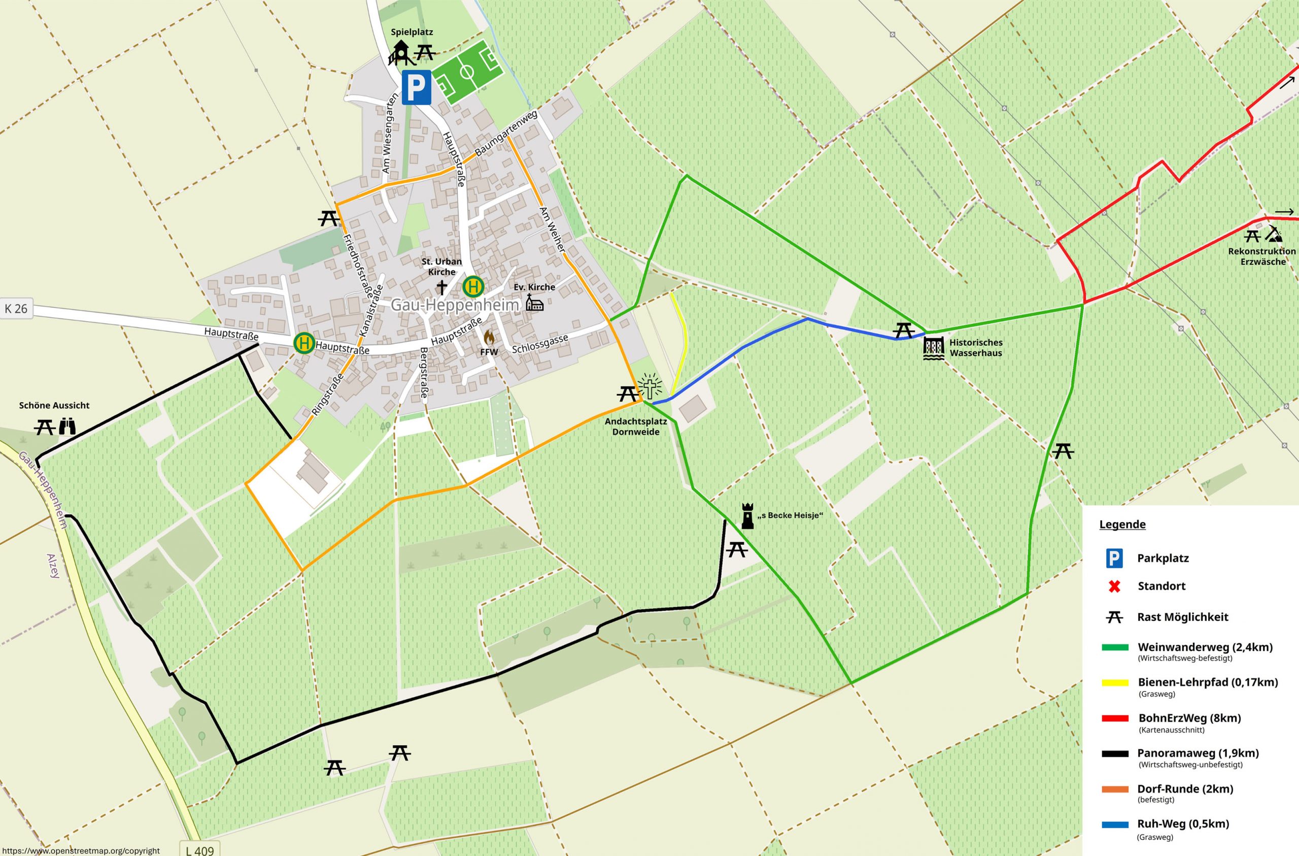 Ein festgelegter Start- oder Zielpunkt existiert nicht. Die Dorfrunde ist offen – man kann sie aus allen Richtungen betreten, oft kreuzt sie sogar die anderen Wanderrouten des Ortes. So fügt sie sich nahtlos in das Wegenetz rund um Gau-Heppenheim ein.
